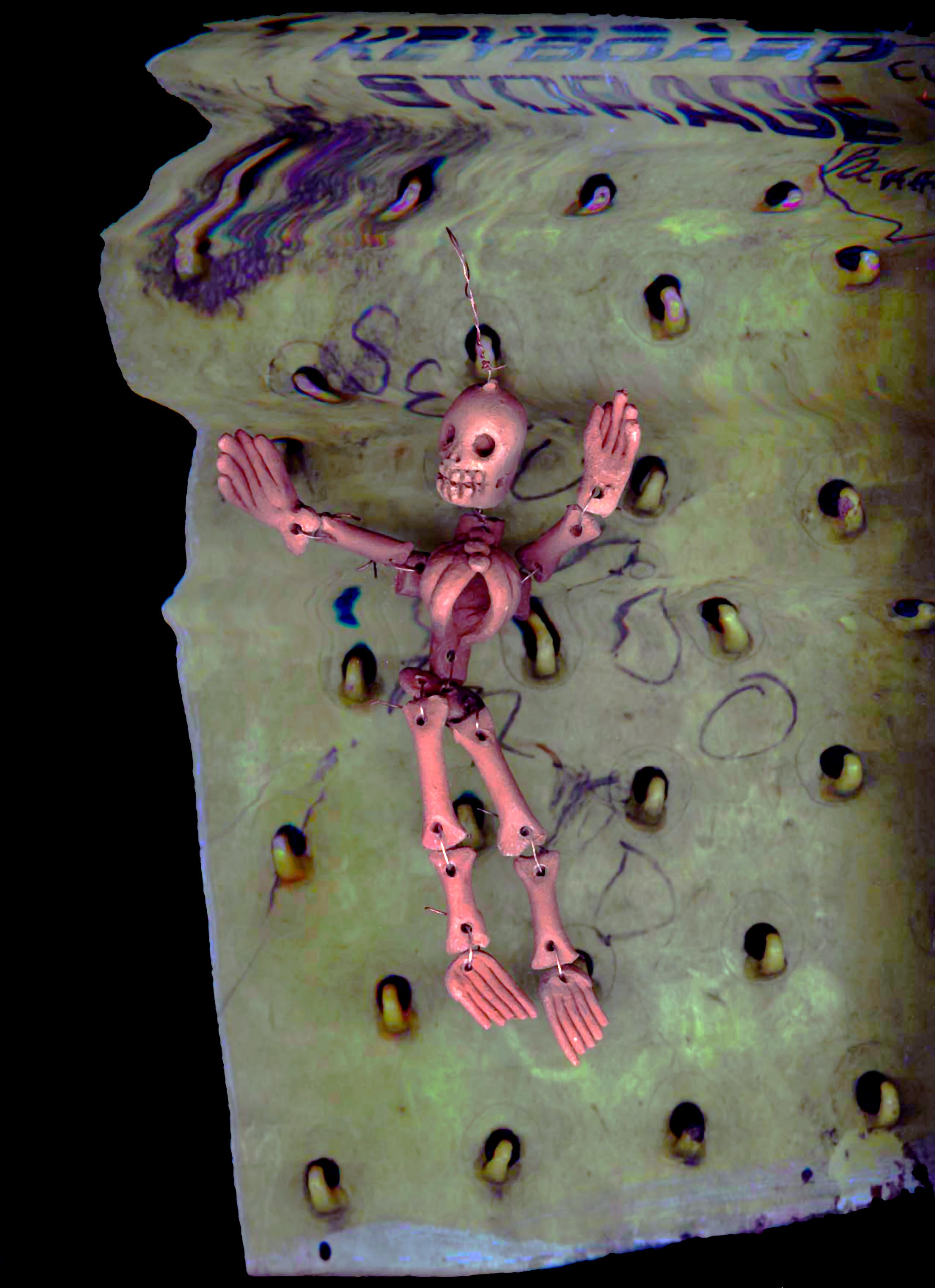 Manger of the night shift workers facing another night at the "Keyboard Satorage Factory." Created using a process called Scanography**, (the capture of live action using the photographic capabilities of a flatbed scanner. The resulting image is called a K-scan. ** Patent pending, KR, 2007