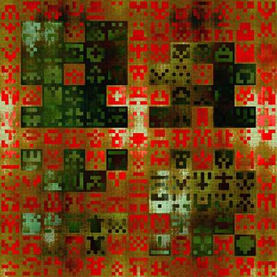A zoomable very high resolution image (65536x65536 pixels) of an algorithmic work constructed on an "invader" pattern. The pattern is piled at various scales, producing an infinitely extended image displaying fractal structure everywhere, what I call an algorithmic world.