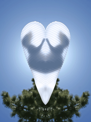 A created life form (twins, perhaps) in an embryonic embrace held within a heart-shaped translucent womb of sorts.